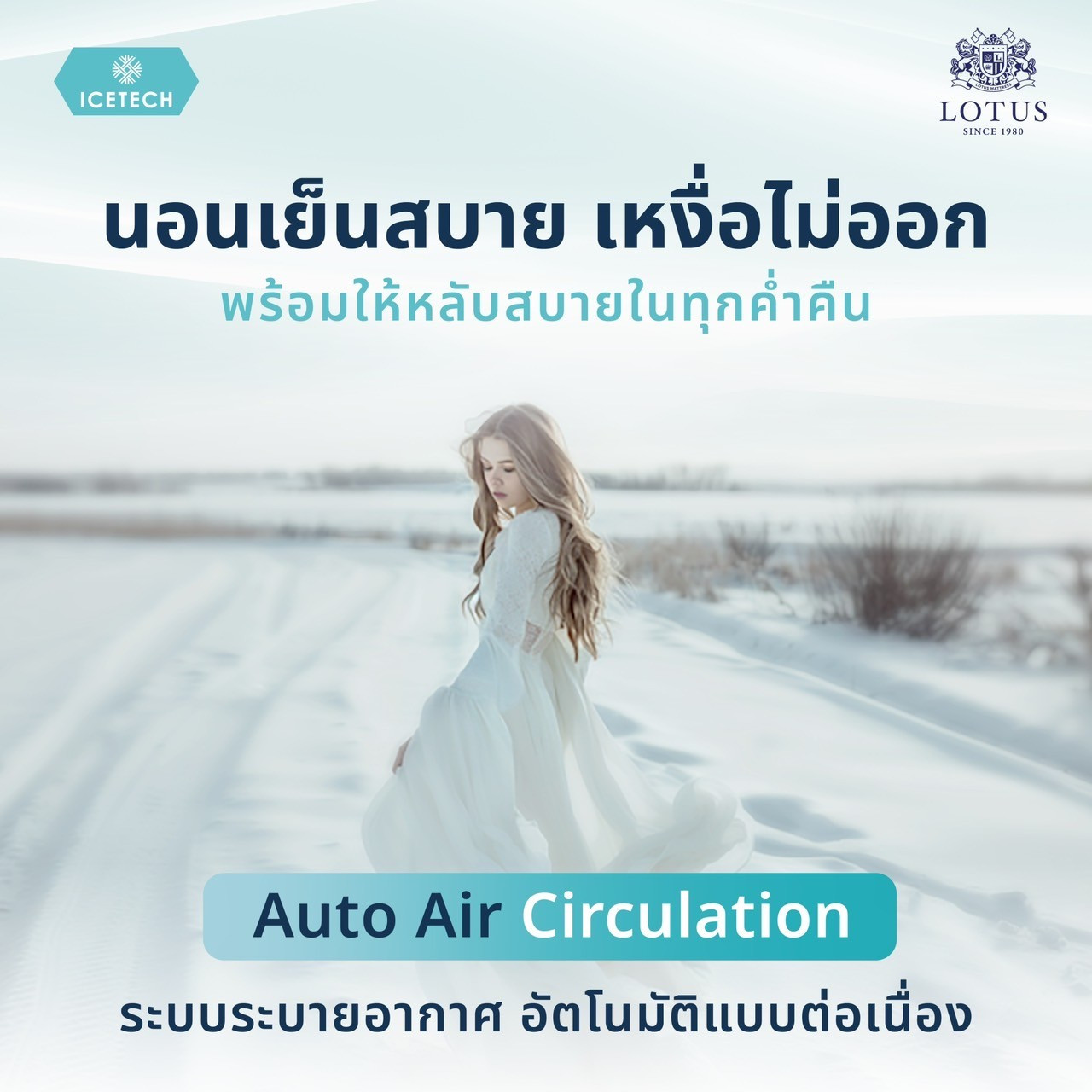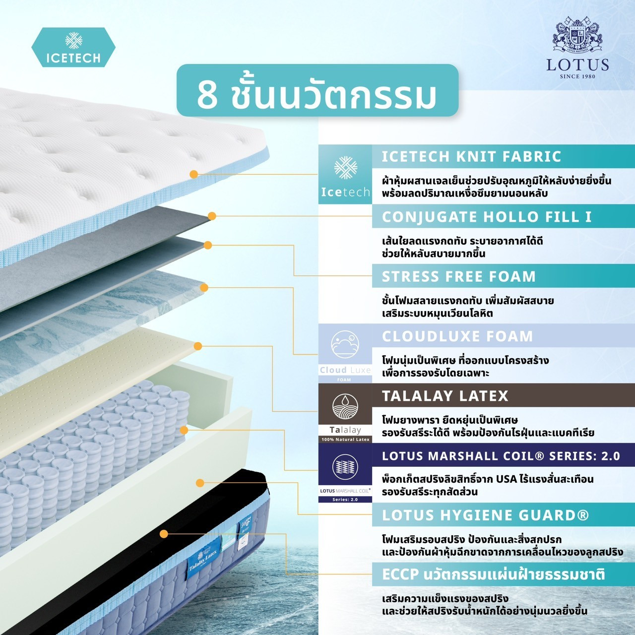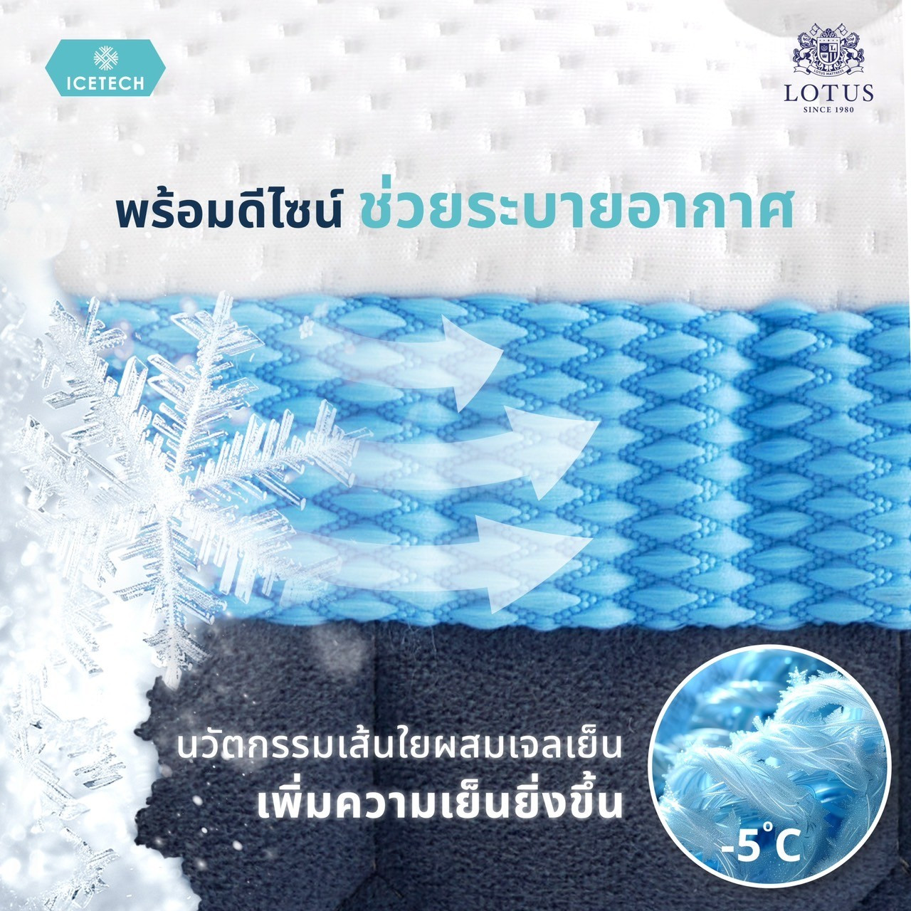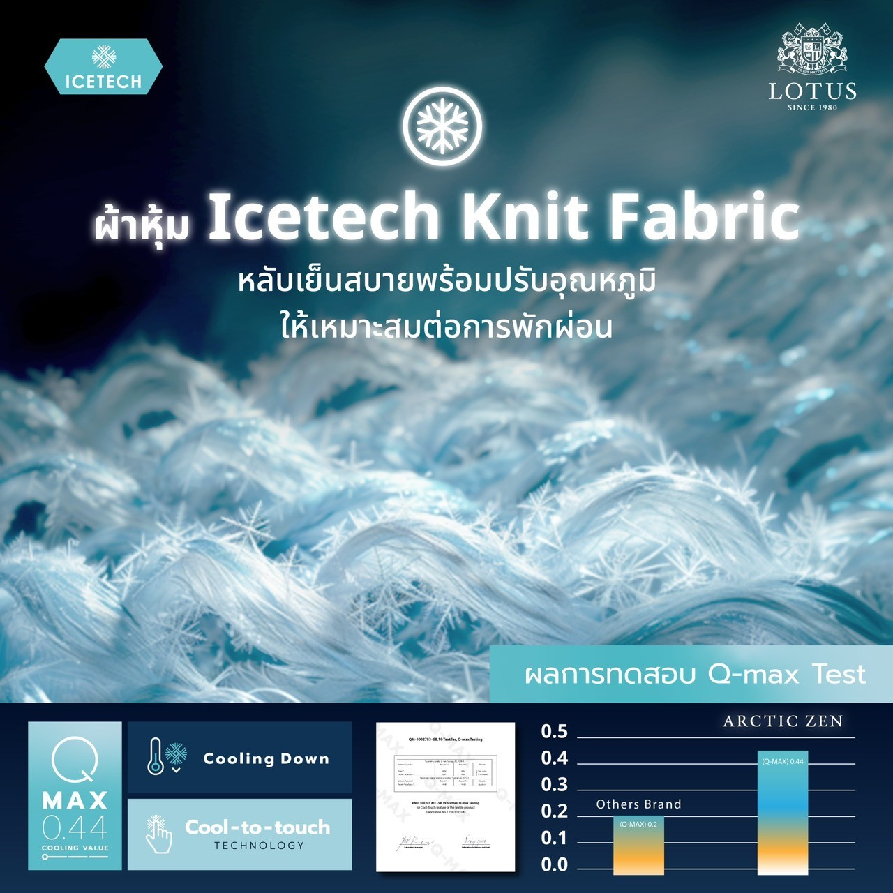 ที่นอน LOTUS Mattress รุ่น Arctic zen ให้คุณสัมผัสความสบายอย่างแท้จริง หลับง่ายยิ่งขึ้นด้วยความเย็นสบายกับผ้าหุ้ม ICETECH knit fabric นวัตกรรมเส้นใยผสานเจลเย็นที่มอบสัมผัสเย็นสบายเพื่อช่วยปรับอุณหภูมิร่างกายให้เหมาะสมต่อการพักผ่อน มาพร้อมดีไซน์ผ้าหุ้มช่วยระบายอากาศ ลดปริมาณเหงื่อซึมยามนอนหลับซึ่งเป็นสาเหตุหนึ่งของการตื่นกลางดึก ให้คุณหลับสนิทยิ่งขึ้นพร้อมกับความเย็นสบายทุกค่ำคืน
