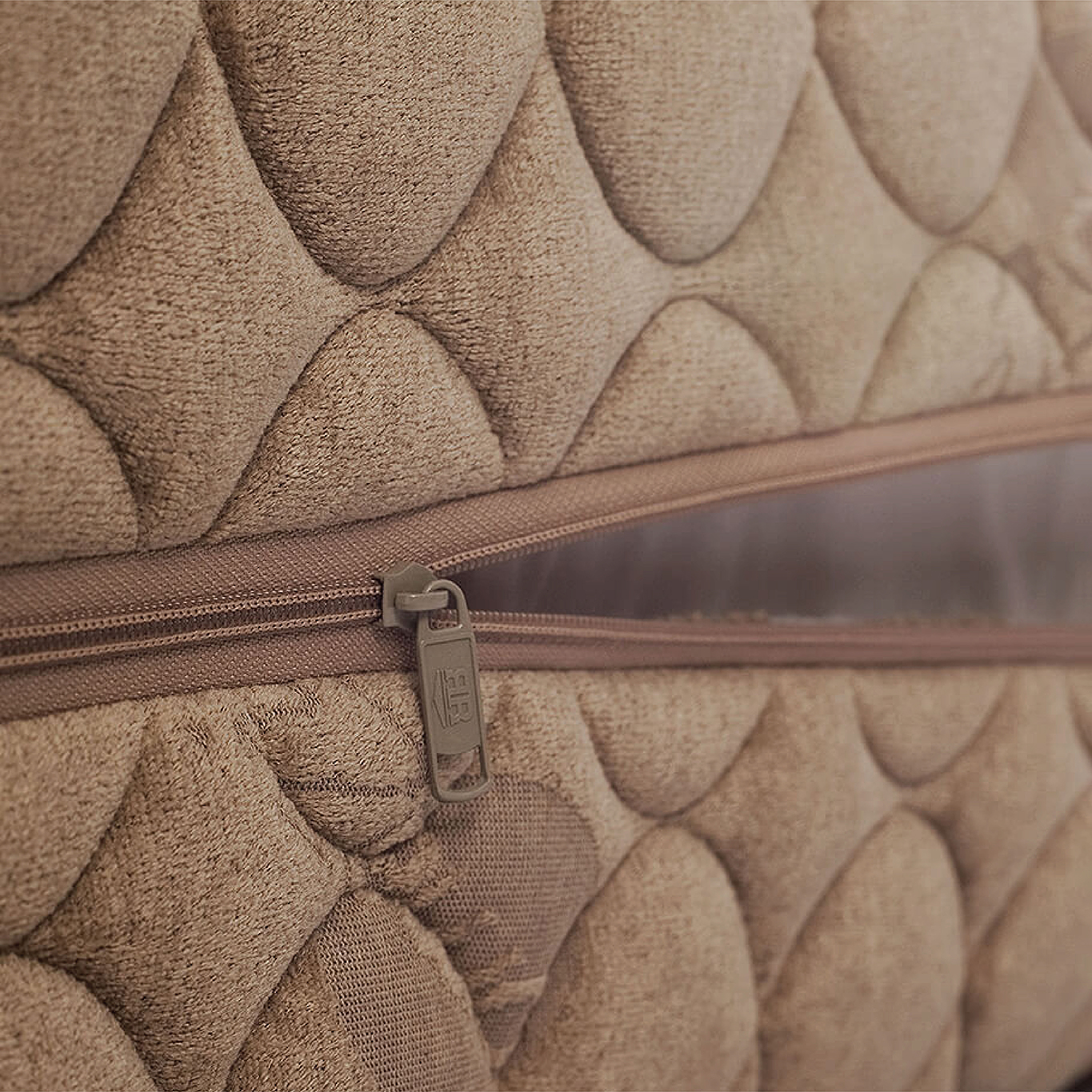 ทำด้วยมืออย่างประณีต ประกอบด้วยกรรมวิธี Hand-made อย่างประณีตในทุกรายละเอียด ด้วยผ้าผนังข้างคอตตอนเวอลัว สีเอิร์ธ คาลาเมล ตัดกับผ้าหุ้มแคชเมียร์ด้านบนสีขาว ดีไซน์เอกลักษณ์เฉพาะของที่นอน เอิร์ธ อีโค คอลเลคชั่น.